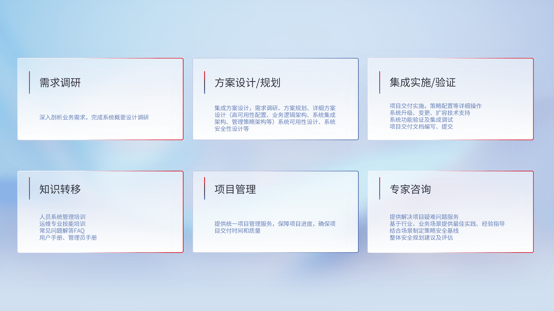 针对客户行业特性,,将宏观的安全战略和需求,,通过专业的交付服务,,实现项目落地,,,,为客户提供标准规范的集成交付服务。。。。